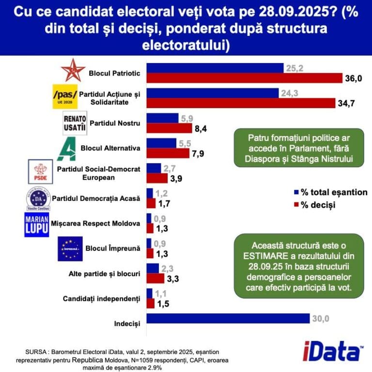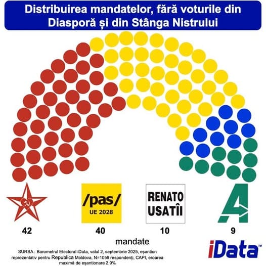 Если бы парламентские выборы состоялись в следующее воскресенье, в парламент прошли бы четыре избирательных конкурента. Это результаты опроса, проведённого компанией iData в период с 20 августа по 3 сентября 2025 года.